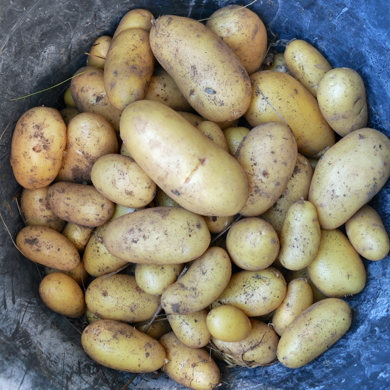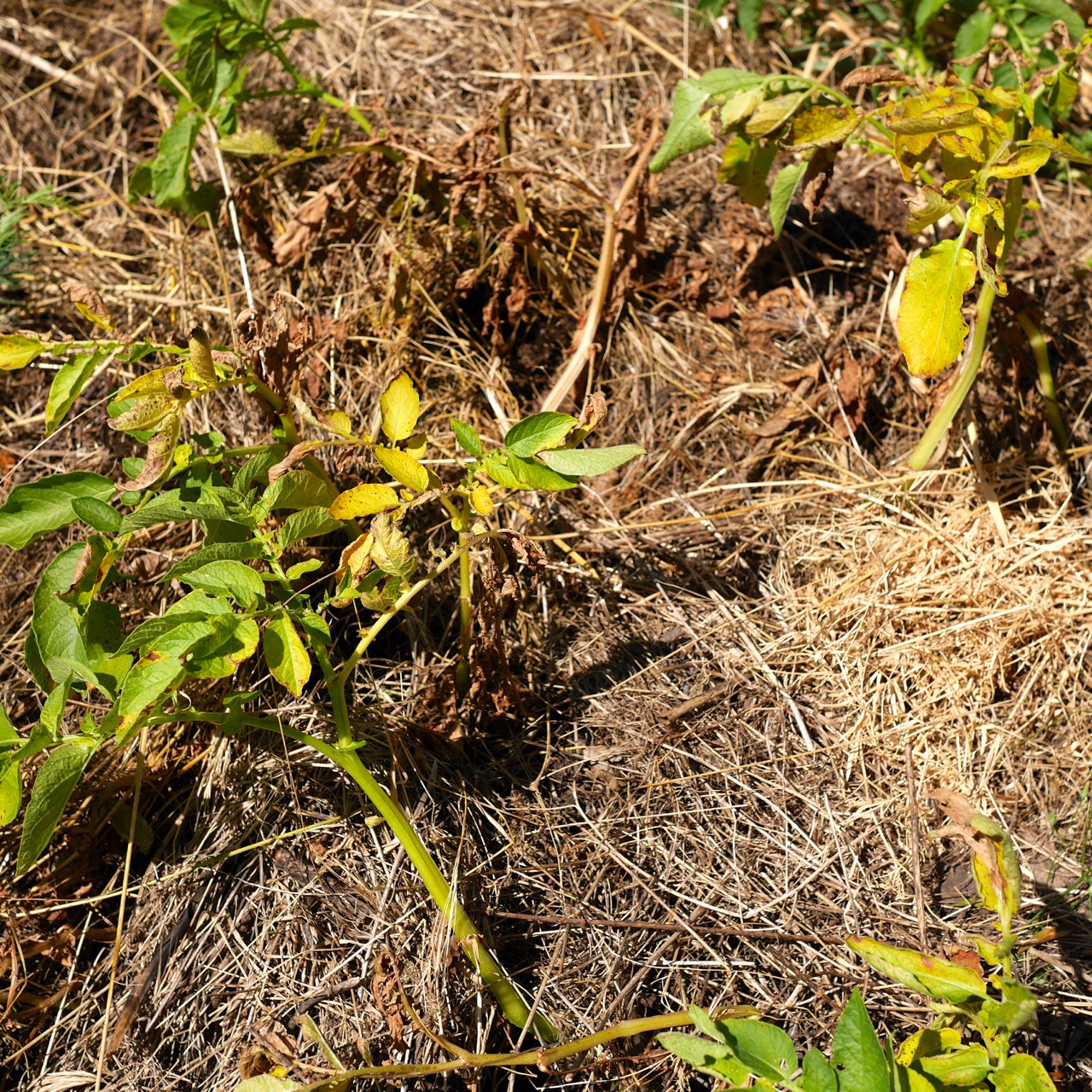 Première récolte de pommes de terre :-) On a cru que les plants étaient malades, mais ils sont juste fanés. Il me semblait pourtant qu'on les récoltait à l'automne, mais apparemment pas toujours.
