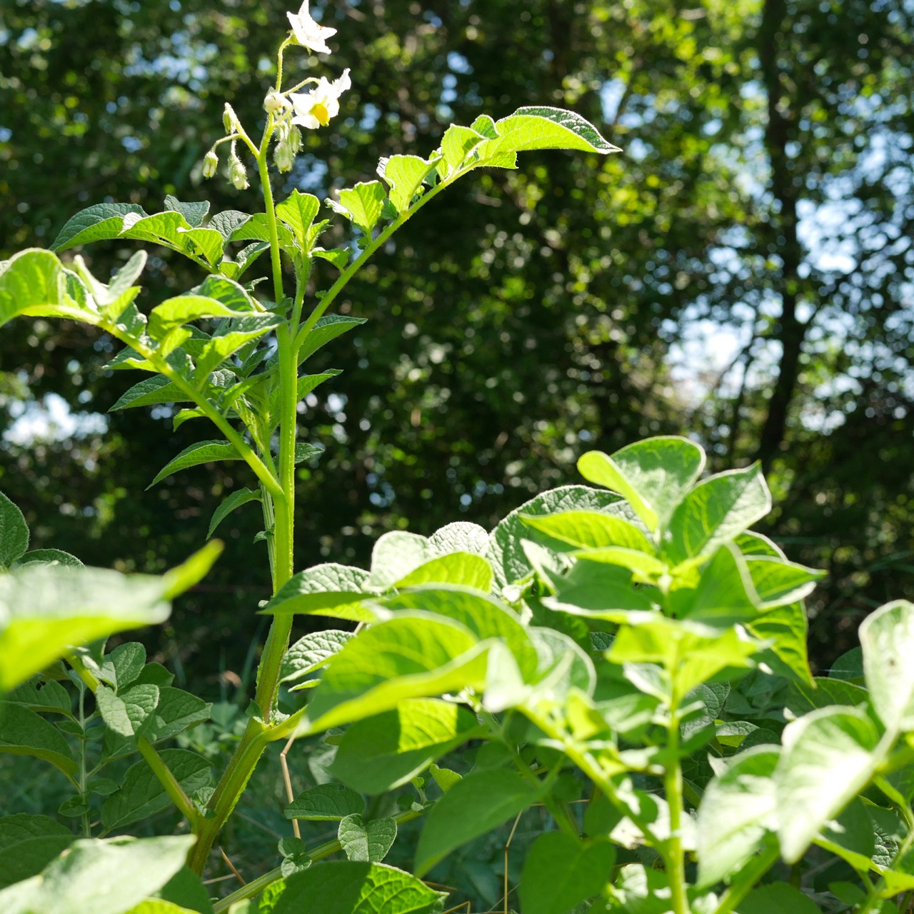 Ce sont des plants issus de patates oubliées en terre. Plus exactement, je les avais plantées avant de partir en Norvège, pour voir comment elles se débrouilleraient pendant 3 mois, toutes seules, et au retour il n'y avait pas trace de pommes de terre, rien du tout, nada. Et cette année, en voulant préparer le sol, on est retombé dessus, et on les a remises au même endroit (je sais, c'est mal). Certaines étaient vraiment toutes petites, 1 ou 2 cm, aucune n'avait germé, mais tout ça a bien gentiment poussé quand même. C'est magique, les pommes de terre, même mes épluchures ont l'air de donner quelque chose :
